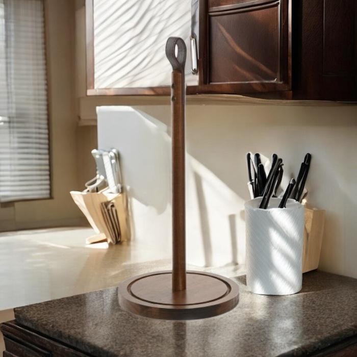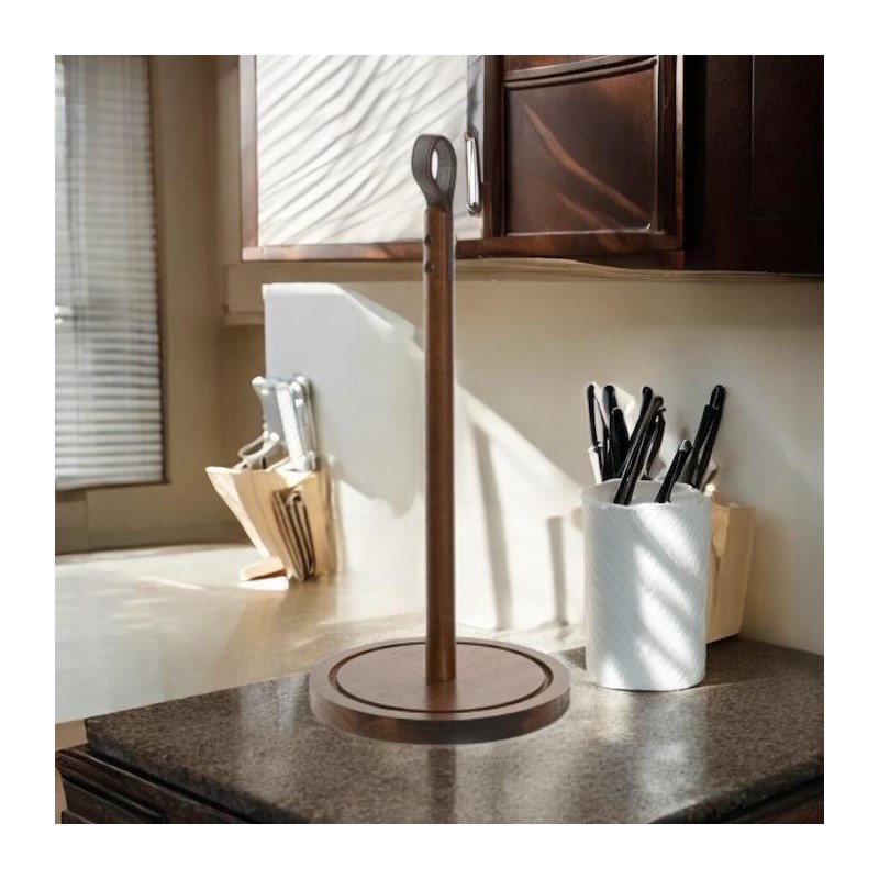 Portarrollos para papel de cocina de acacia natural combinado en la zona de sujeción con cuero.