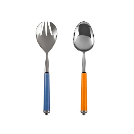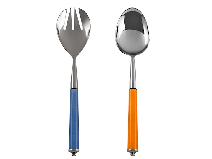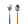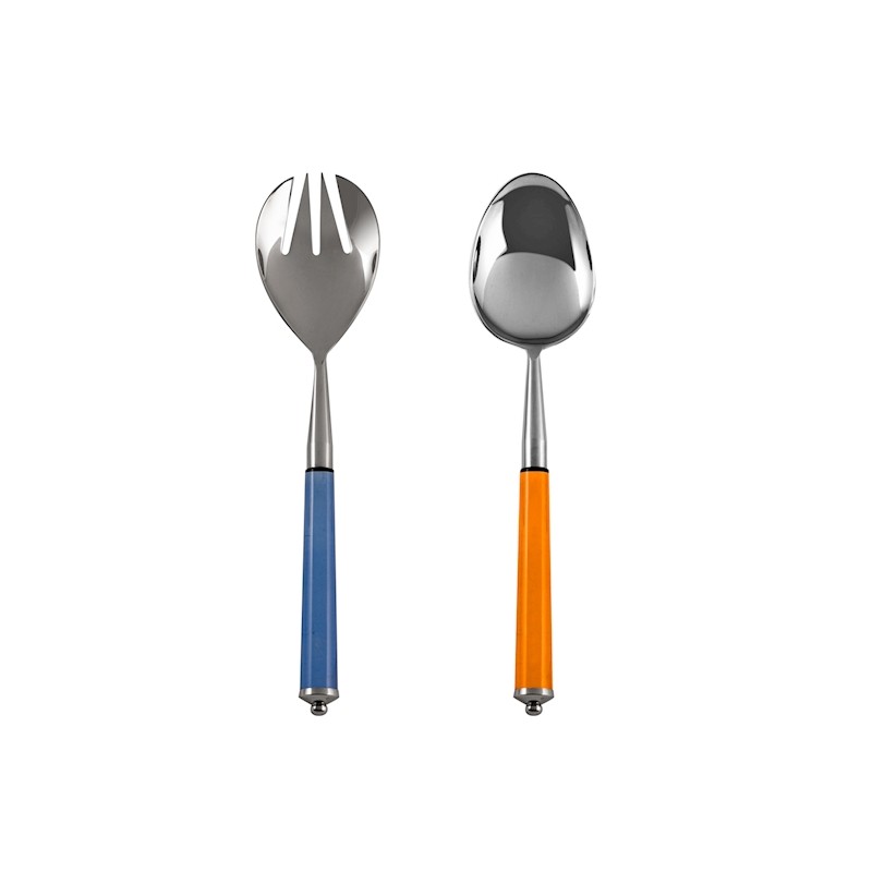 Juego de 2 cubiertos para ensalada de acero inoxidable 18/8 con mangos de acrílico naranja y azul.