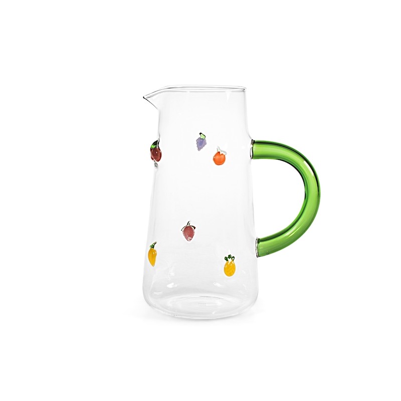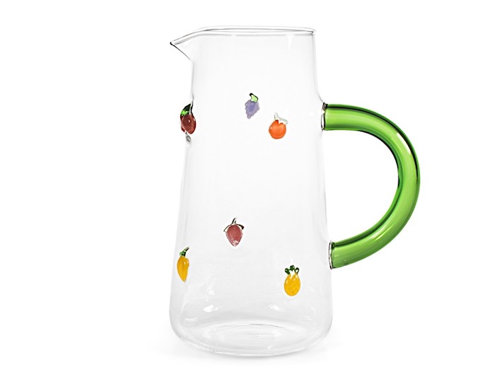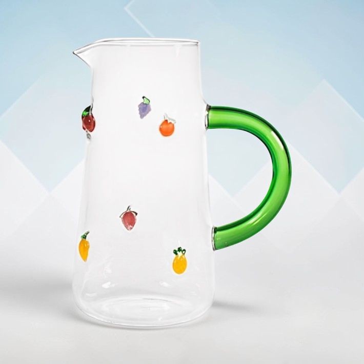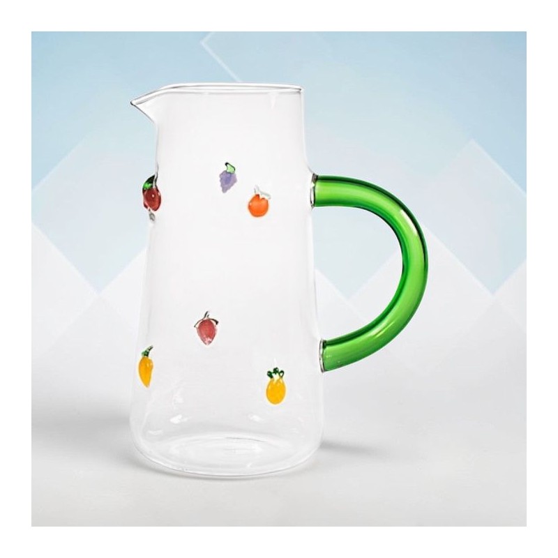 Jarra de borosilicato decorado con miniaturas de fruta. A juego con los vasos