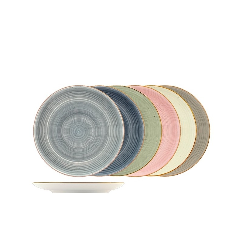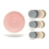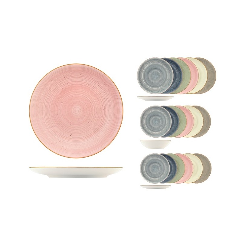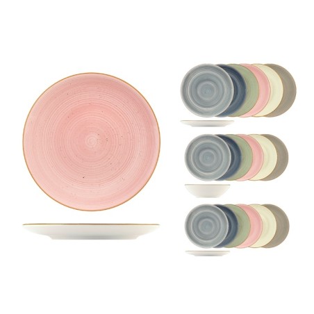 Incluye seis platos llanos de 26 cm, seis platos hondos de 20,5 cm y seis platos de postre de 19,5 cm.