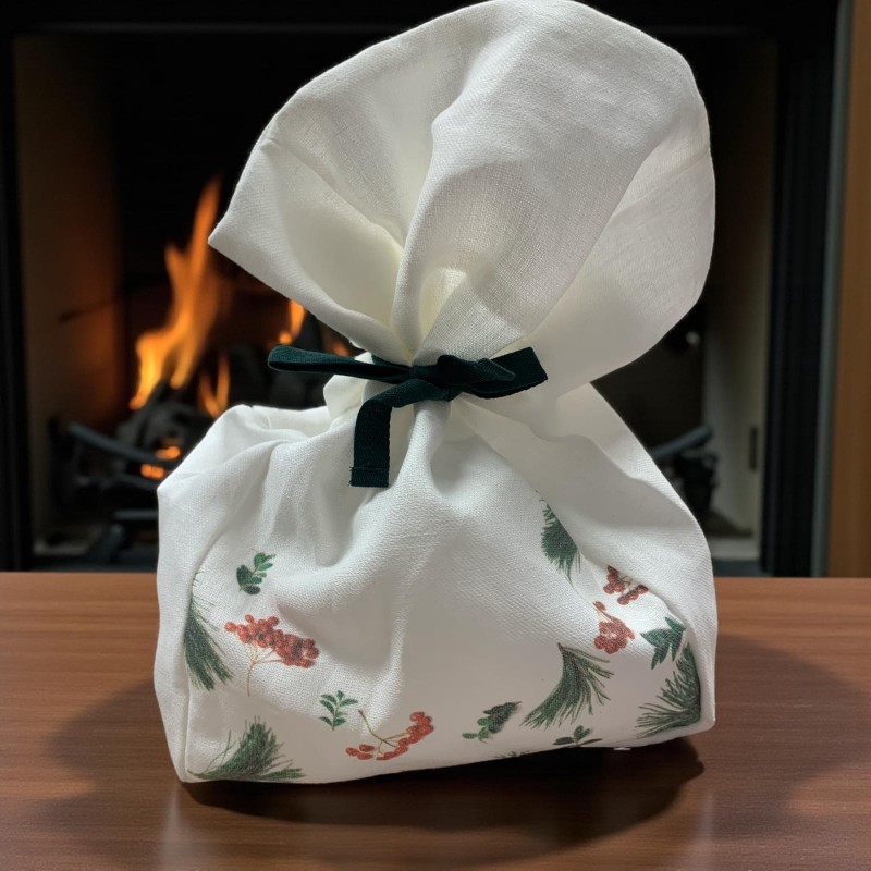A juego bolsita para el pan , que se ata con una lazada y permite que el pan quede aislado de la mesa.
