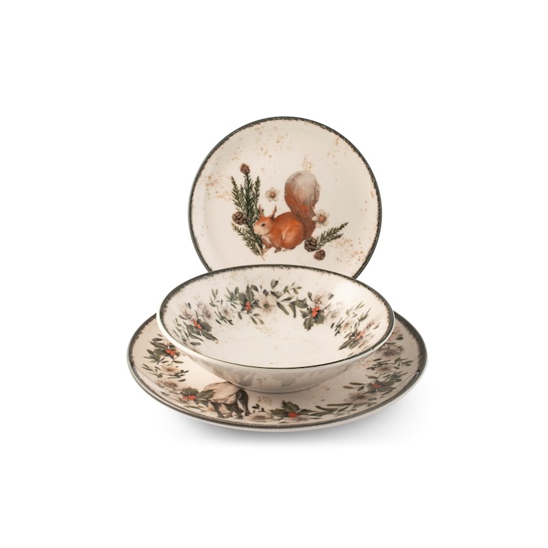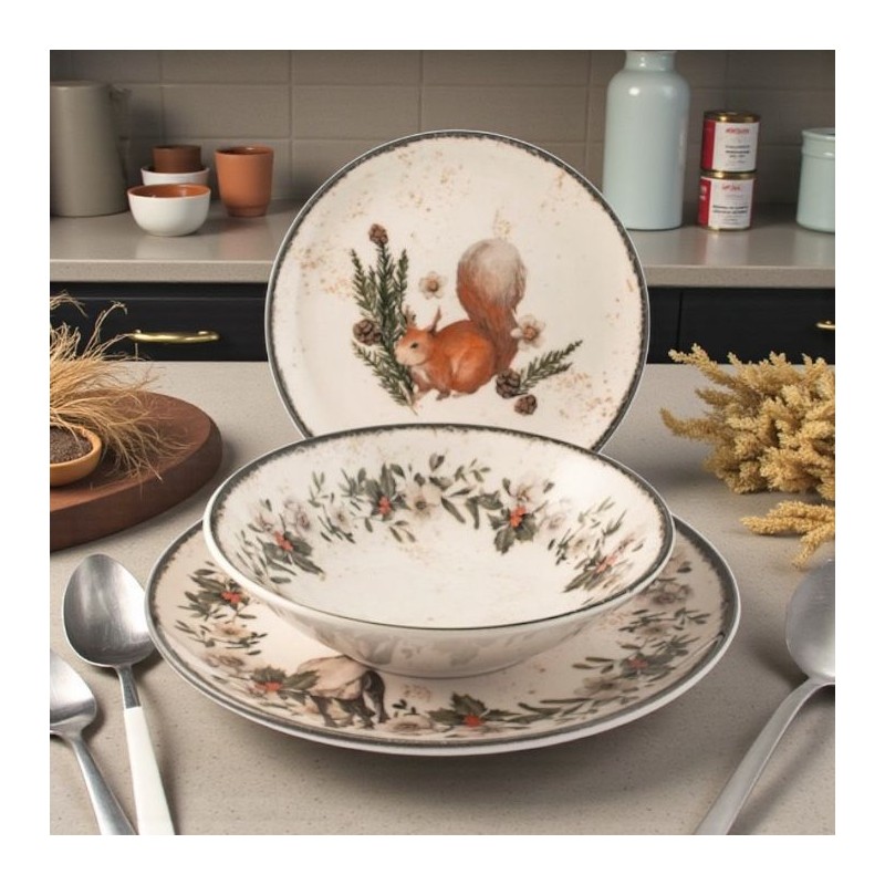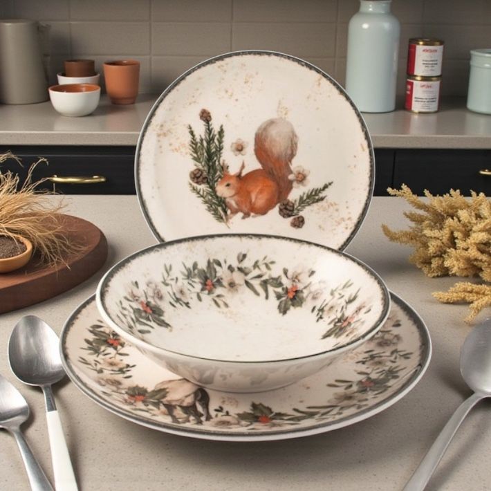 Déjate seducir por esta vajilla de estilo nórdica, clásica y atemporal. Su estilo y decoración la hace ideal para el tiempo de otoño y Navidad.