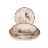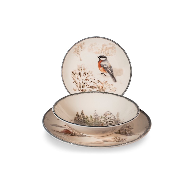 Vajilla de 18 piezas en gres decorado compuesta por 6 platos llanos de 26 cm, 6 platos hondos de 20,5 cm y 6 platos de postre de 18,5 cm